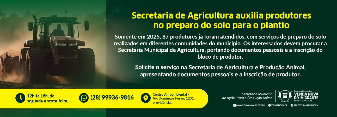 Somente em 2025, 87 produtores já foram atendidos, com serviços de preparo do solo realizados em diferentes comunidades do município. Os interessados devem procurar a Secretaria Municipal de Agricultura, portando documentos pessoais e a inscrição do bloco de produtor.