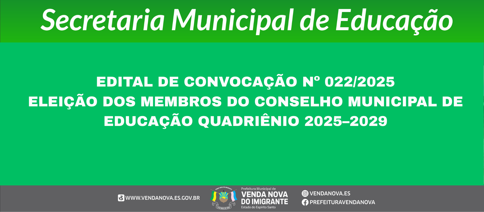 O Município de Venda Nova do Imigrante – ES, por meio da Secretaria Municipal de Educação, no uso de suas atribuições legais e com fundamento na Lei Municipal nº 301/1997, torna público o presente Edital que regulamenta o processo de escolha dos representantes da sociedade civil para compor o Conselho Municipal de Educação para o quadriênio 2025–2029.