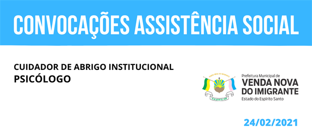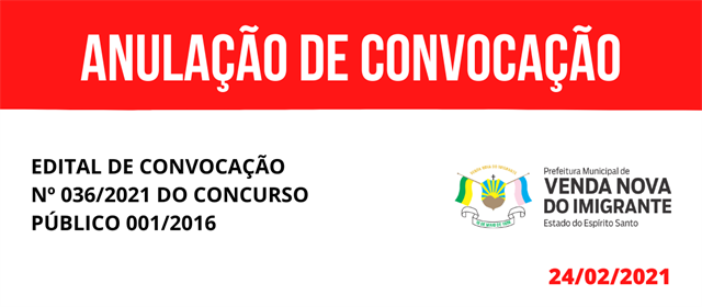 A Prefeitura Municipal de Venda Nova do Imigrante torna pública a Anulação da Convocação nº 036/2021, do Concurso Público 001/2016.