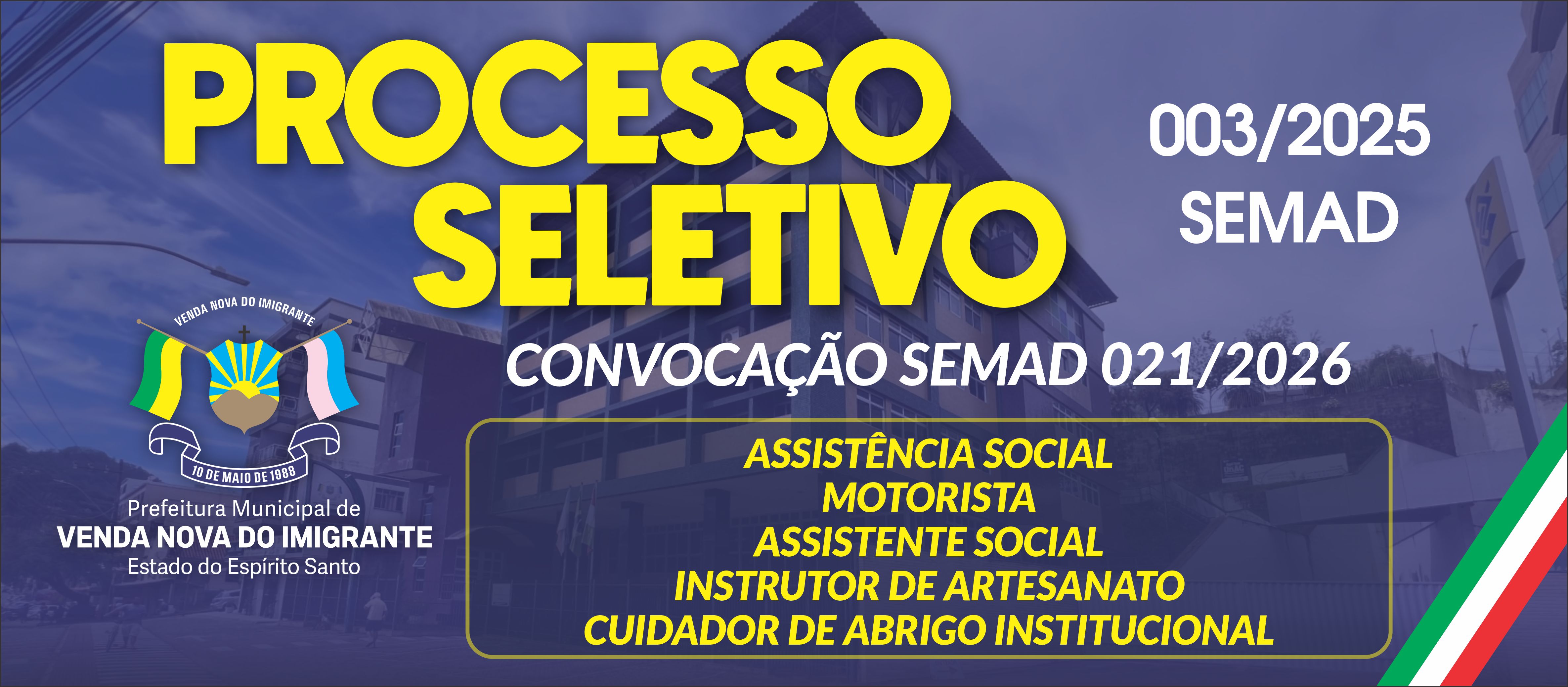 CONVOCAÇÃO SEMAD 021-2026 - ASSISTÊNCIA SOCIAL - MOTORISTA - ASSISTENTE SOCIAL - INSTRUTOR DE ARTESANATO - CUIDADOR DE ABRIGO INSTITUCIONAL - 18/02/2026