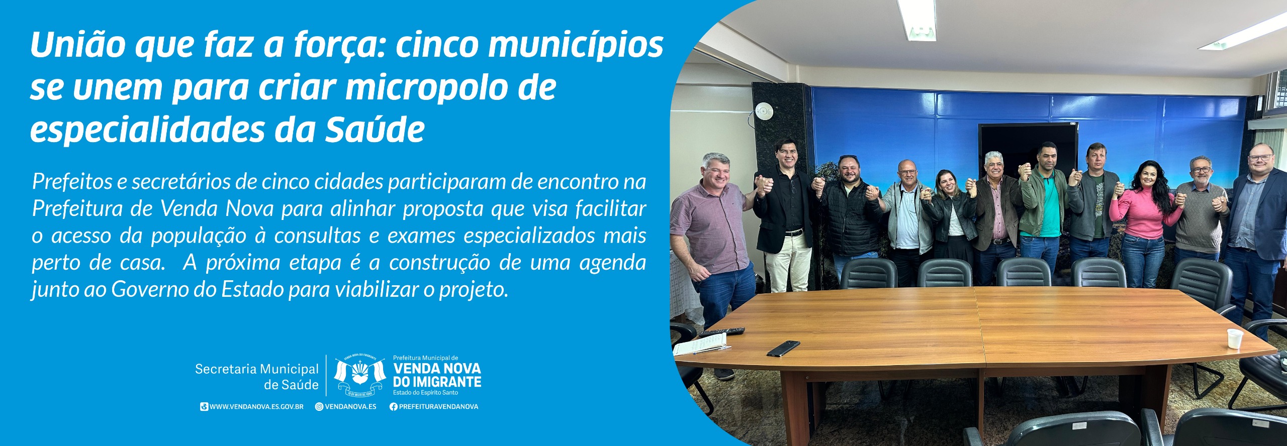 Prefeitos e secretários de cinco cidades participaram de encontro na Prefeitura de Venda Nova para alinhar proposta que visa facilitar o acesso da população à consultas e exames especializados mais perto de casa. A próxima etapa é a construção de uma agenda junto ao Governo do Estado para viabilizar o projeto.