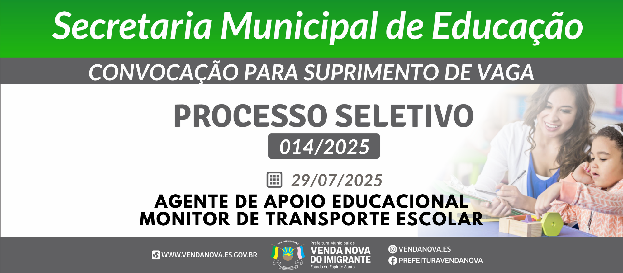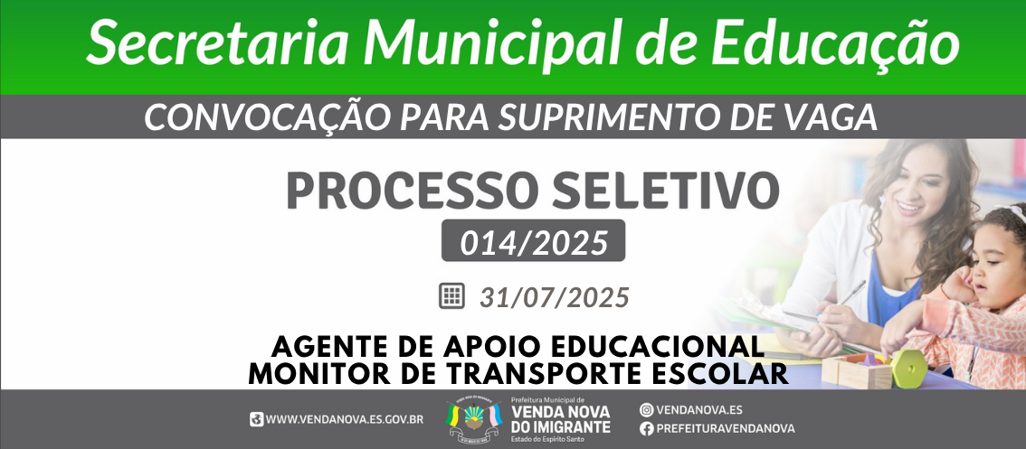 CONVOCAÇÃO PARA SUPRIMENTO DE VAGA - AGENTE DE APOIO EDUCACIONAL E MONITOR DE TRANSPORTE ESCOLAR