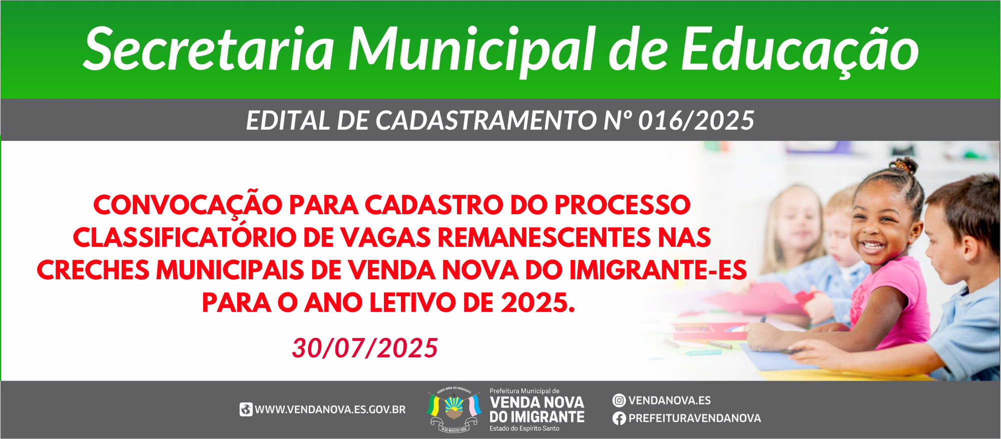 EDITAL DE CADASTRAMENTO Nº 016/2025 - VAGAS REMANESCENTES NAS CRECHES MUNICIPAIS