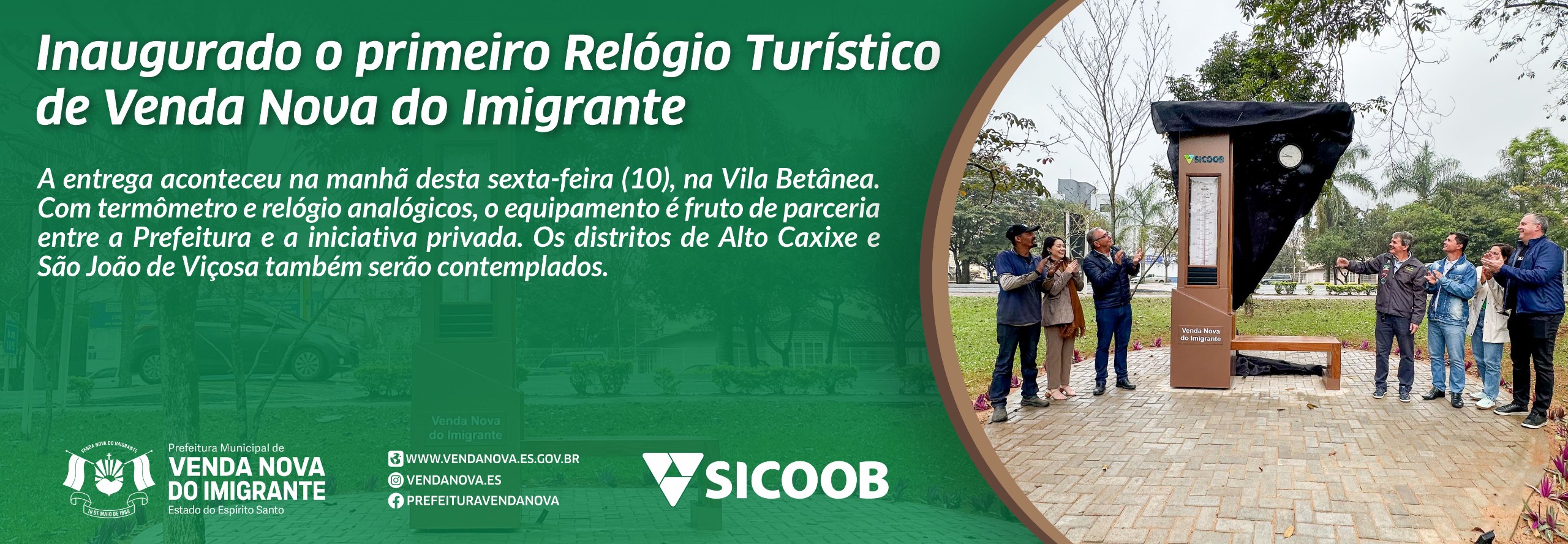 A entrega aconteceu na manhã desta sexta-feira (11), na Vila Betânea. Com termômetro e relógio analógicos, o equipamento é fruto de parceria entre a Prefeitura e a iniciativa privada. Os distritos de Alto Caxixe e São João de viçosa também serão contemplados.