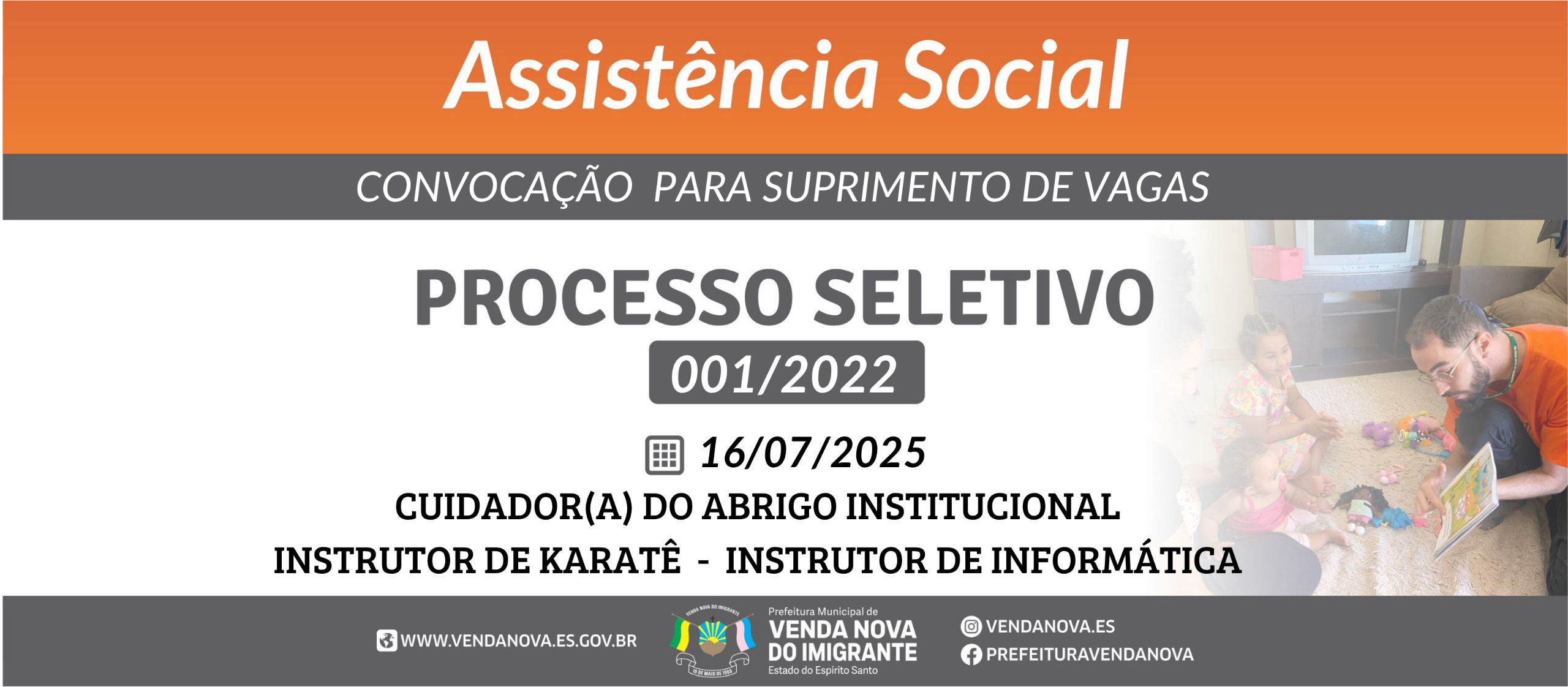 CONVOCAÇÃO PARA: Cuidador (a) do Abrigo Institucional, Instrutor de Karatê e Instrutor de Informática