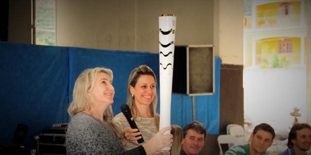Pedagoga Regiane Coradine Cocco apresentou a tocha com a qual participou do revezamento em Cachoeiro de Itapemirim.