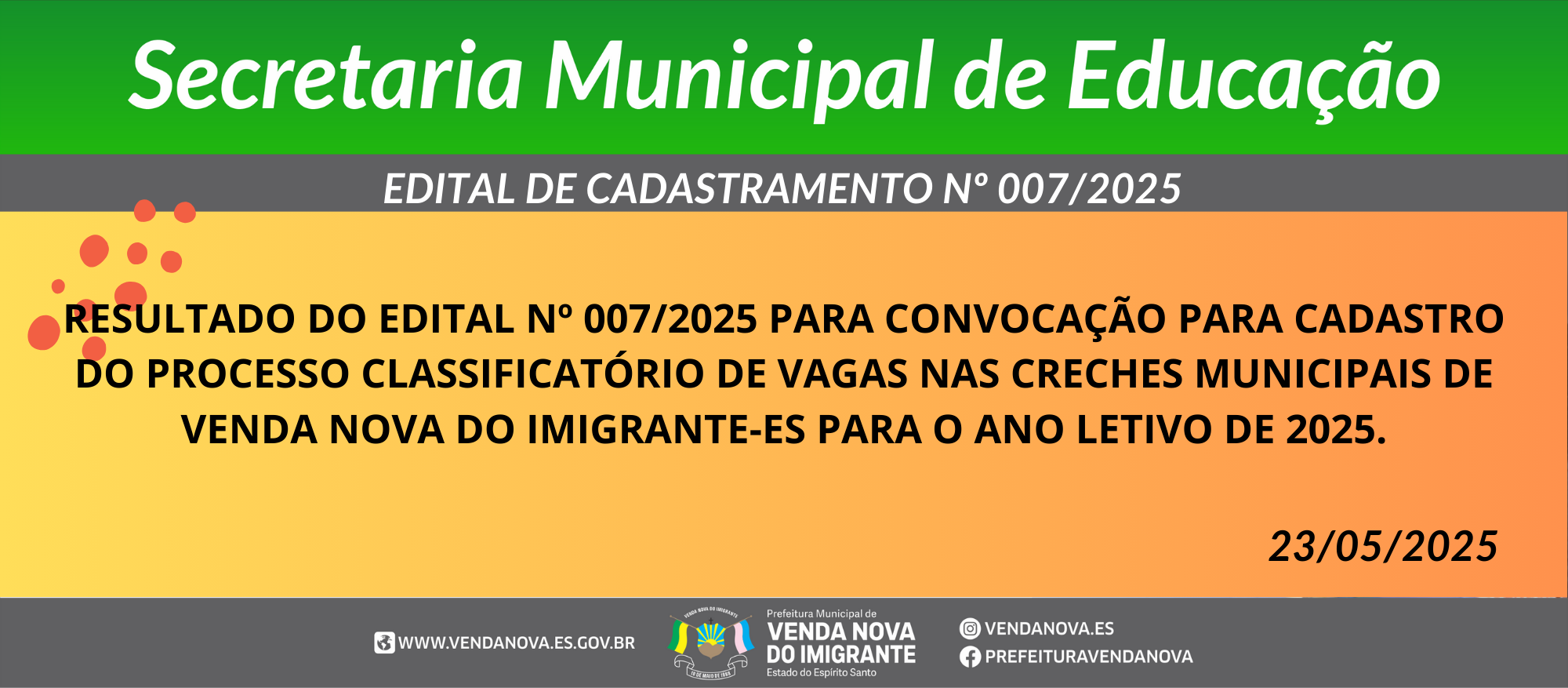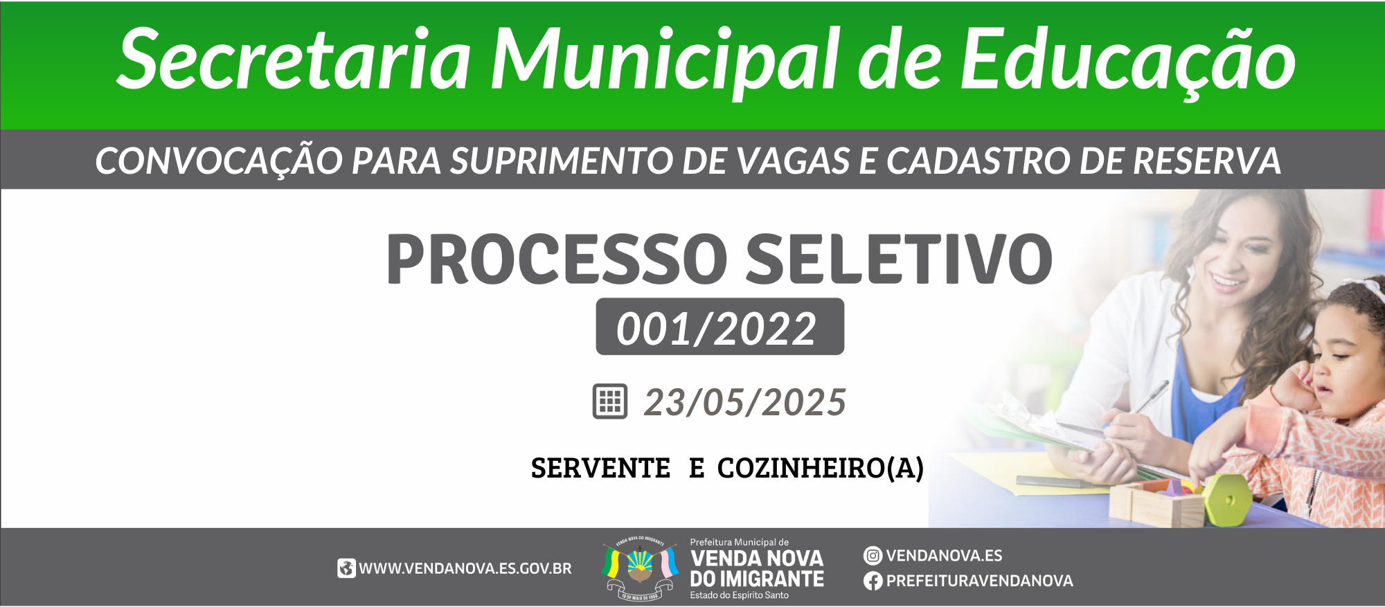 VAGAS NAS CRECHES MUNICIPAIS DE VENDA NOVA DO IMIGRANTE-ES PARA O ANO LETIVO DE 2025.