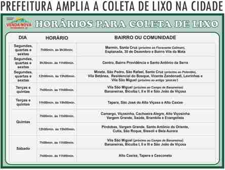 A Prefeitura Municipal, por meio das Secretarias Municipais de Meio Ambiente e de Obras de Venda Nova do Imigrante está divulgando a tabela de novas rotas e horários de coleta de lixo no Município.