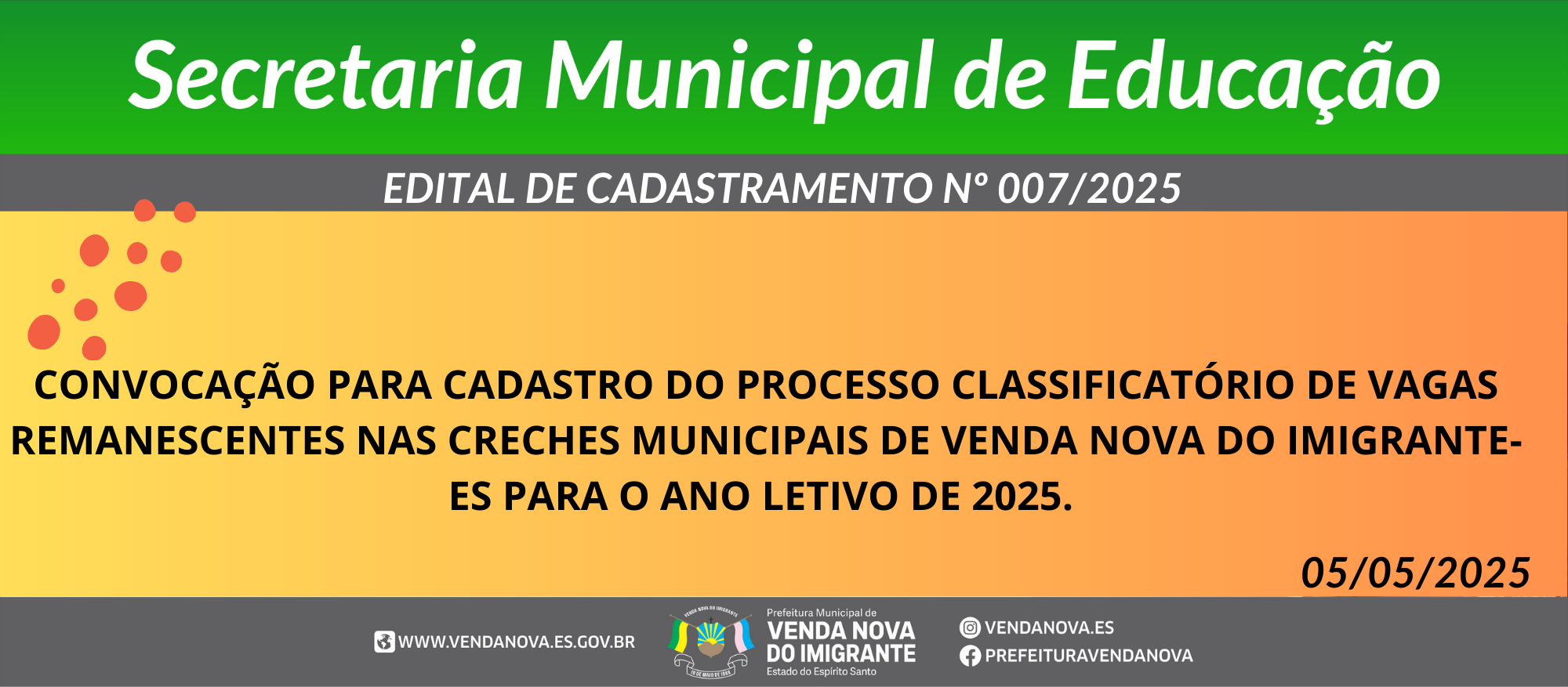 VAGAS REMANESCENTES NAS CRECHES MUNICIPAIS DE VENDA NOVA DO IMIGRANTE-ES PARA O ANO LETIVO DE 2025.