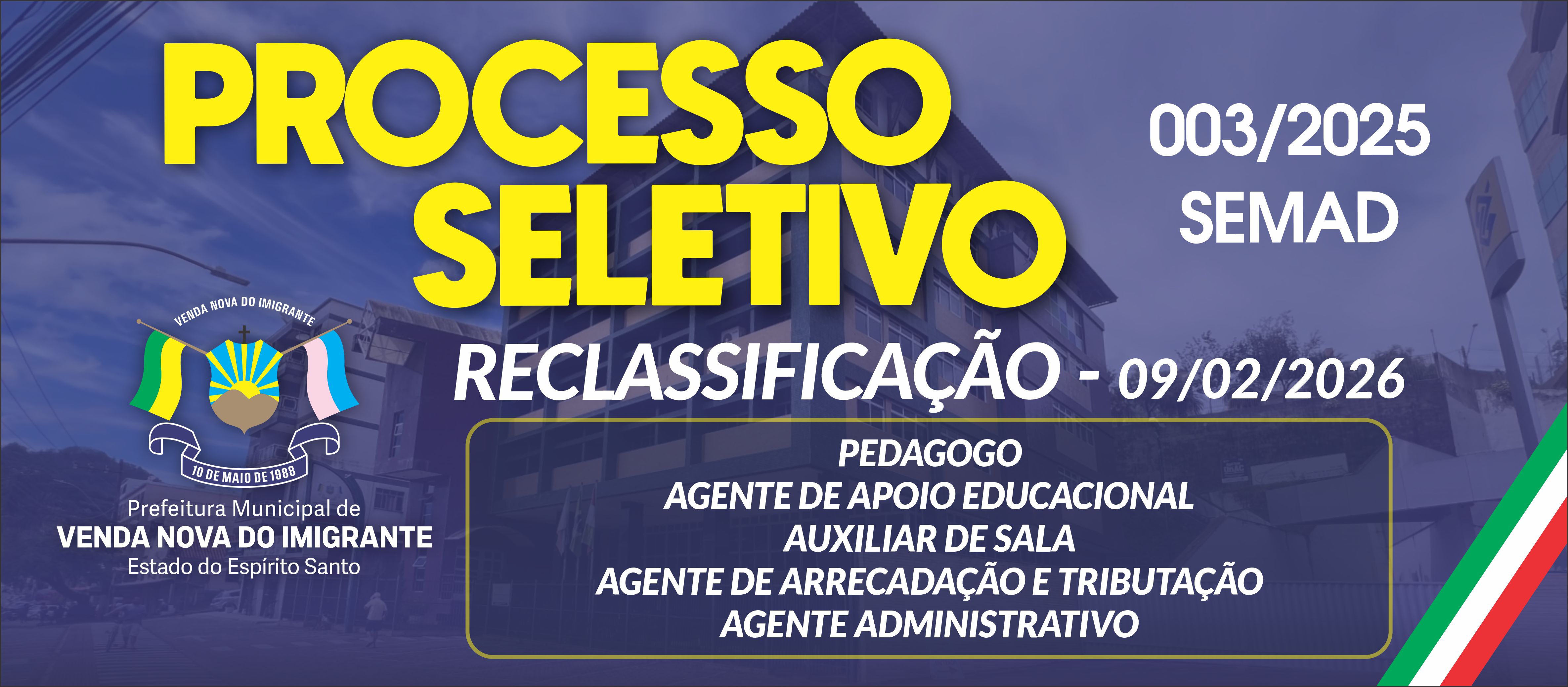 RECLASSIFICAÇÃO - PEDAGOGO - AGENTE DE APOIO EDUCACIONAL - AUXILIAR DE SALA - AGENTE DE ARRECADAÇÃO E TRIBUTAÇÃO - AGENTE ADMINISTRATIVO - 09/02/2026