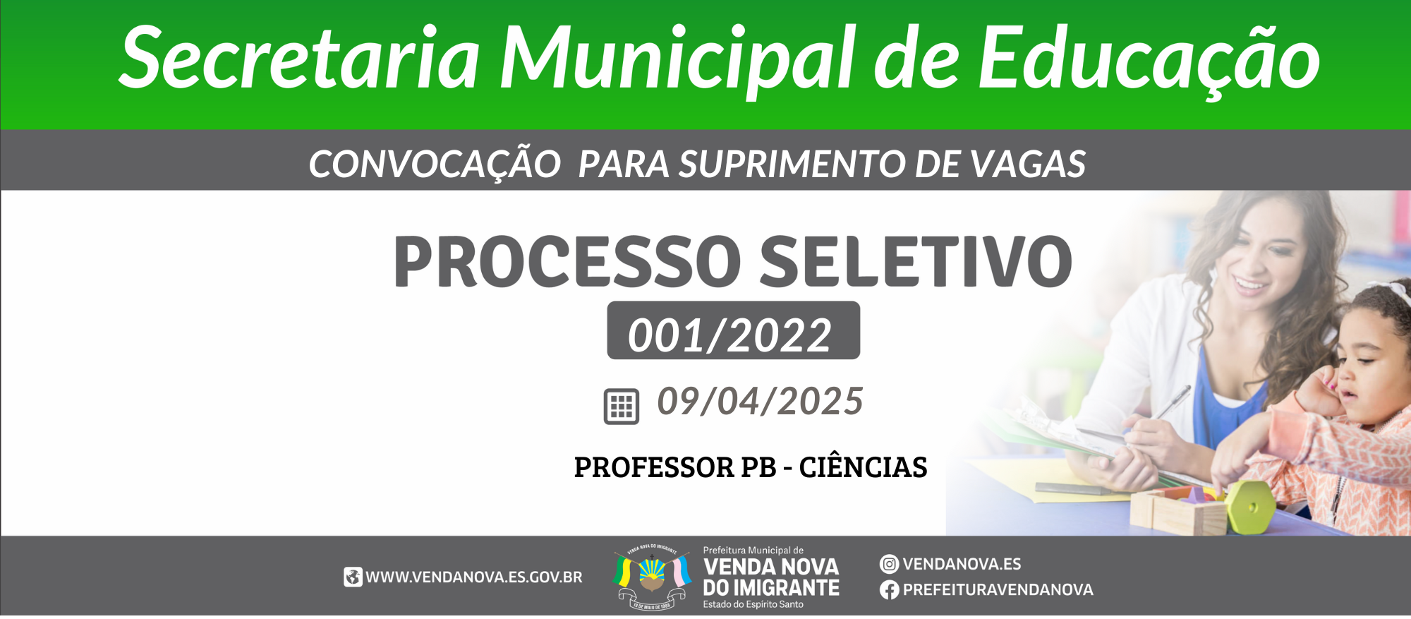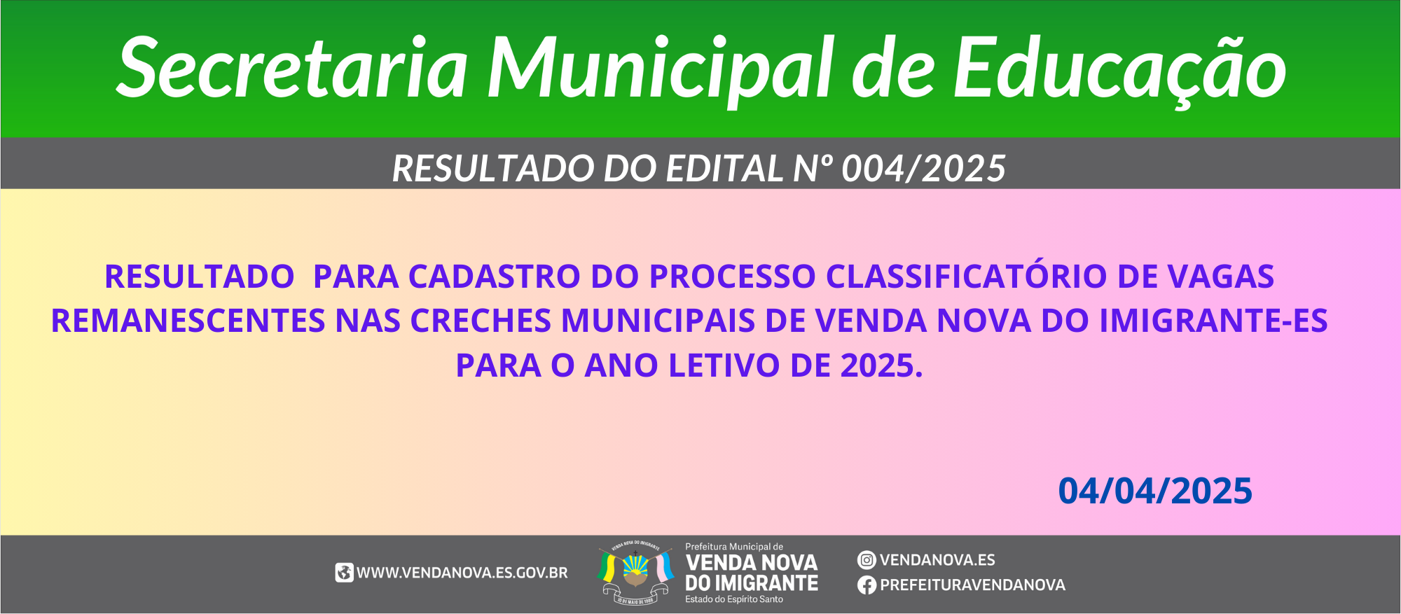 A Secretaria Municipal de Educação comunica o resultado final do Edital Nº. 004/2025 para o cadastramento de vagas para o ano letivo de 2025.