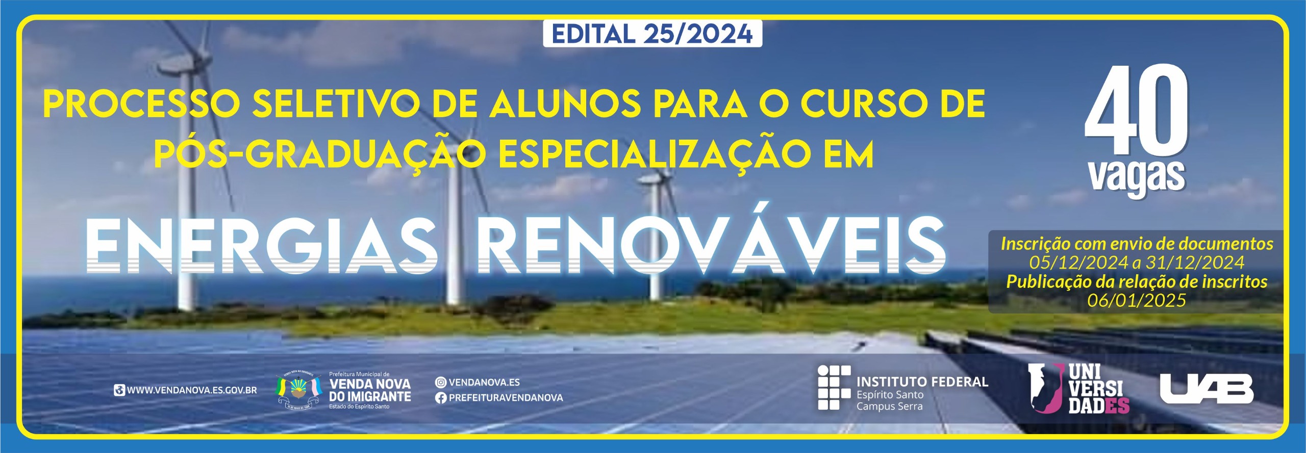 Abertas as Inscrições para o Processo Seletivo da Especialização em Energias Renováveis – Polo de Venda Nova do Imigrante