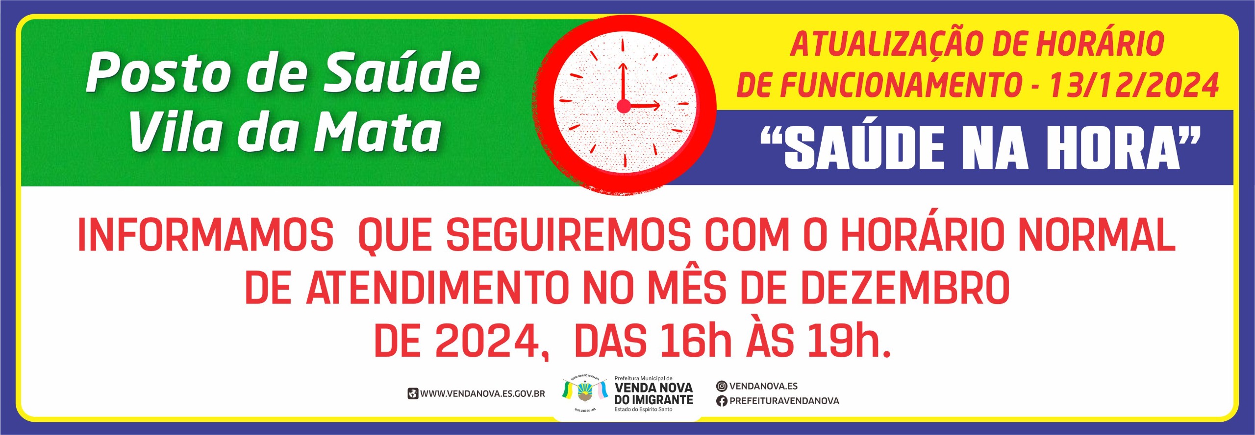 Atualização sobre o horário de atendimento da Unidade de Saúde da Família Vila da Mata