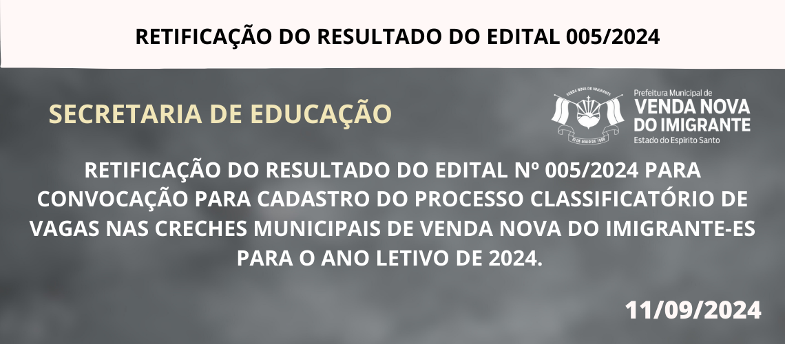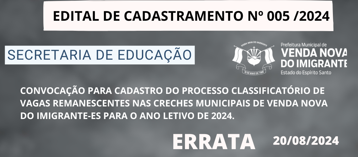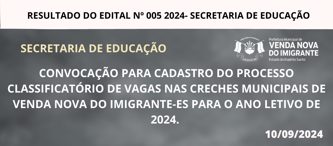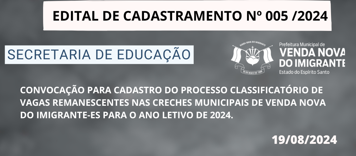 Convocação para cadastro do processo classificatório de vagas remanescentes nas creches municipais de Venda Nova Do Imigrante - ES