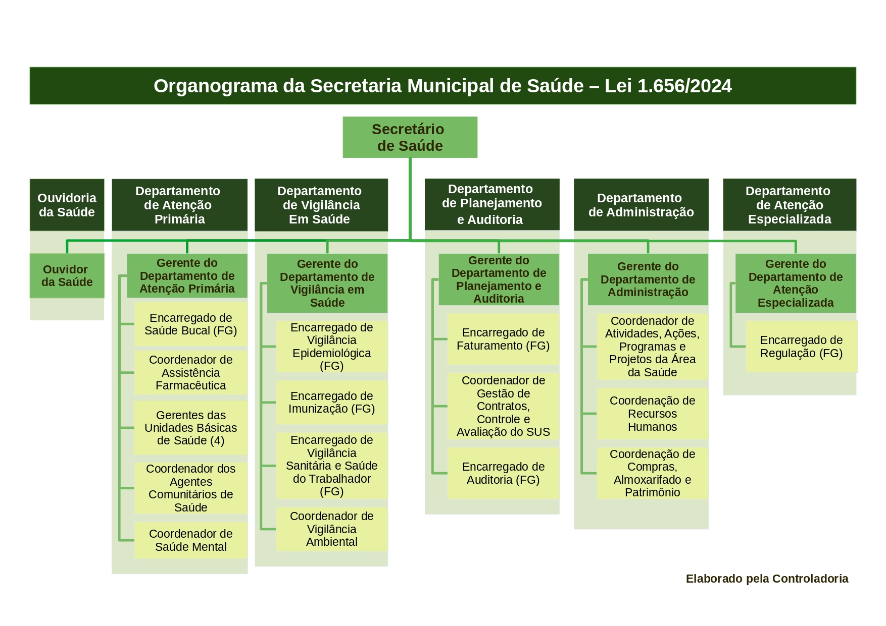A Secretaria Municipal de Saúde (SEMUS) tem suas atribuições definidas no art. 115 da Lei Complementar nº. 1.656/2024, destacando-se a gestão da saúde no Município de forma a viabilizar o acesso universal, igualitário e integral da população a serviços de saúde de qualidade; desenvolver relações de vínculo e responsabilidade com a população sob sua área de abrangência; organizar e manter os diversos sistemas de informação em saúde atualizados, permitindo conhecer as condições de saúde dos cidadãos e priorizar ações resolutivas; desenvolver a gestão da saúde de forma transparente, promovendo a divulgação dos resultados alcançados em processo contínuo de comunicação em saúde; desenvolver e executar ações de vigilância em saúde, bem como normatizar, complementarmente, a legislação em vigor, assegurando o seu cumprimento; executar programas especiais de saúde de iniciativa própria ou através de convênios com a União e o Estado; coordenar e executar as ações pactuadas entre o Município, o Estado e a União, garantindo a correta aplicação dos recursos em consonância com o princípio de equidade; planejar, coordenar, supervisionar e controlar as atividades específicas de zeladoria, transportes, vigilância patrimonial e serviços administrativos, bem como zelar pela guarda dos bens móveis, equipamentos, instalações e arquivos de documentação pertinentes à Secretaria Municipal, em coordenação com a Secretaria Municipal de Administração.