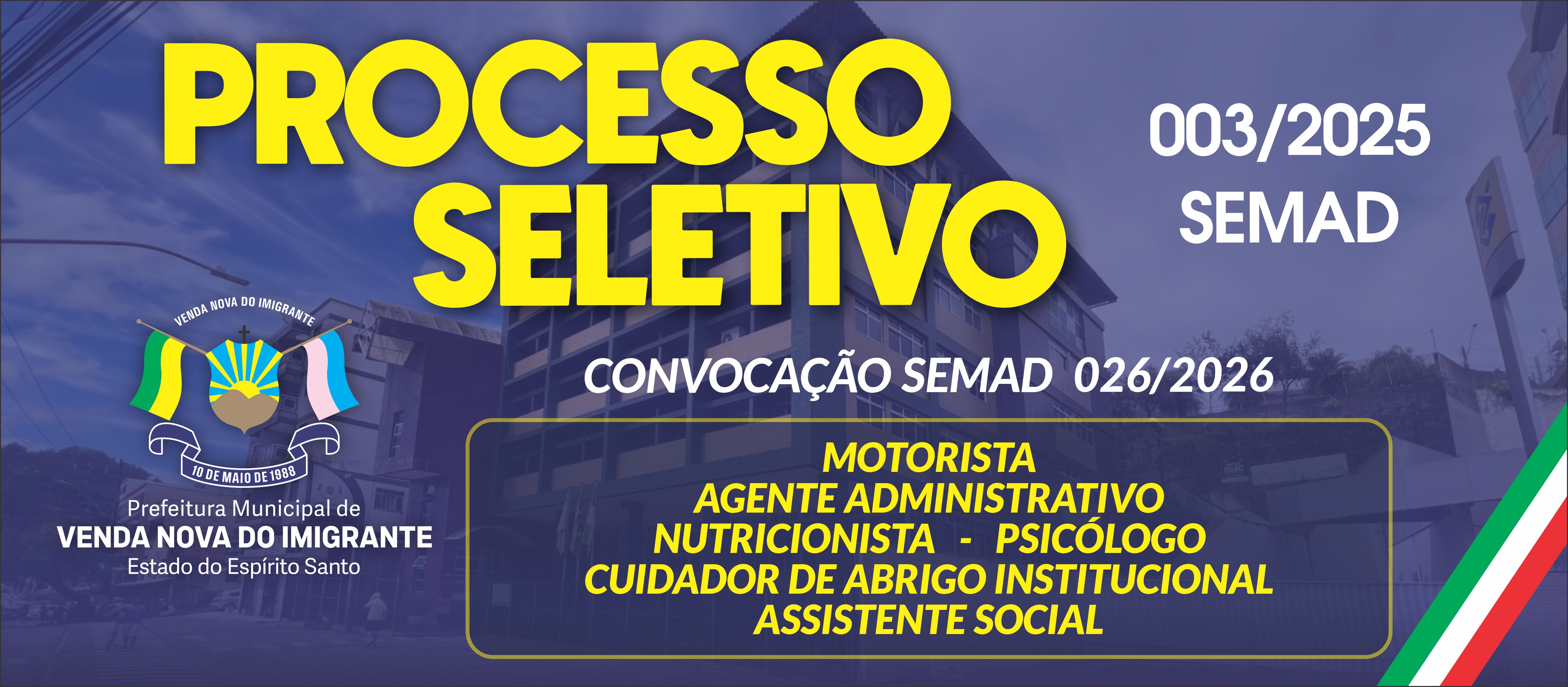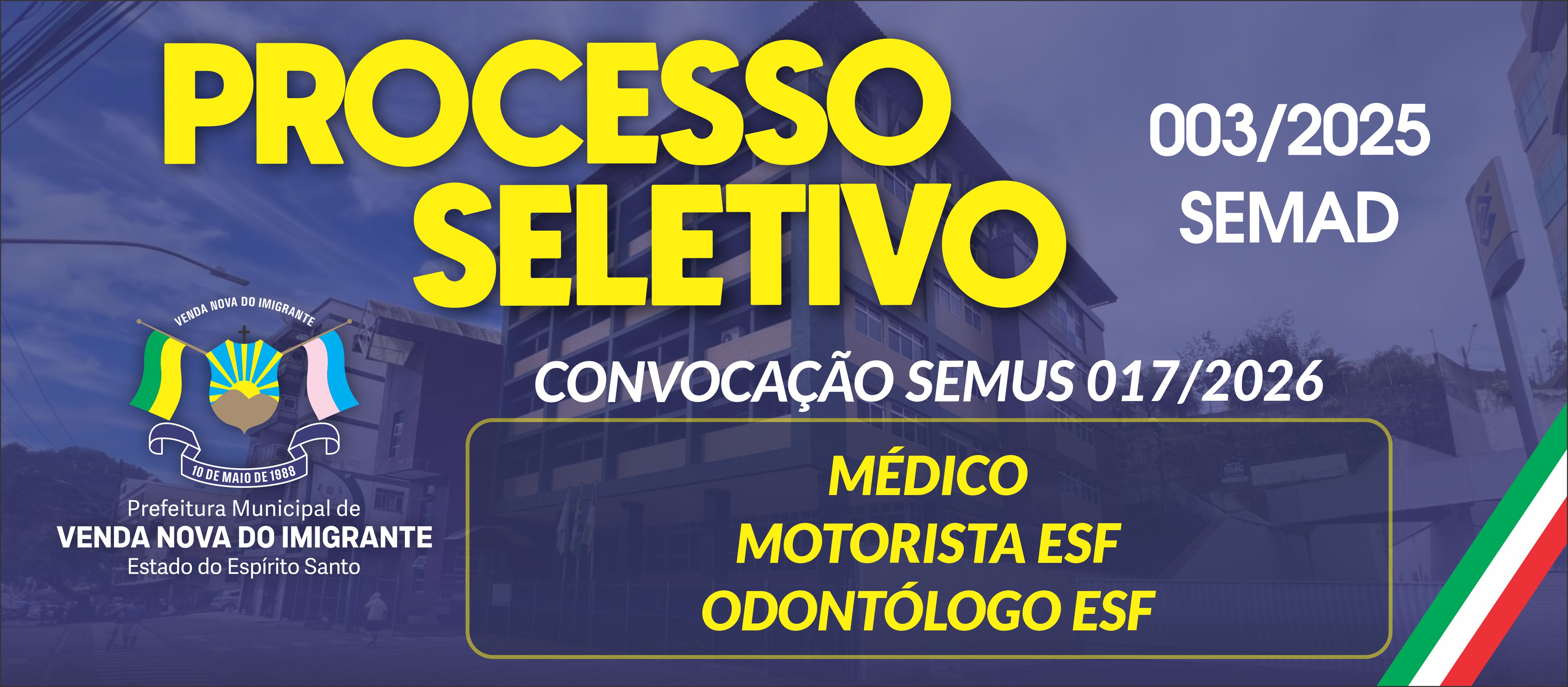 A PREFEITURA MUNICIPAL DE VENDA NOVA DO IMIGRANTE, por intermédio da Secretaria Municipal de Saúde, considerando o surgimento de vagas e a necessidade de suprir as demandas e garantir o bom funcionamento do serviço público, bem como o disposto no Edital de Processo Seletivo Simplificado nº 032/2025, cujo resultado foi devidamente publicado,