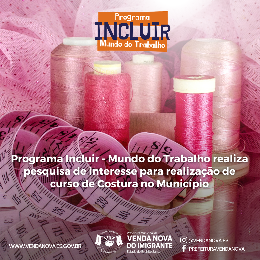 A Prefeitura de Venda Nova do Imigrante, através da Secretaria Municipal de Assistência Social, no Programa Incluir - Mundo do Trabalho está com pesquisa de interesse para a realização de curso de Costura (Alfaiataria e Industrial) em Venda Nova do Imigrante. Os interessados devem preencher o formulário online até o dia 20 de junho. Preencha o formulário de interesse aqui.