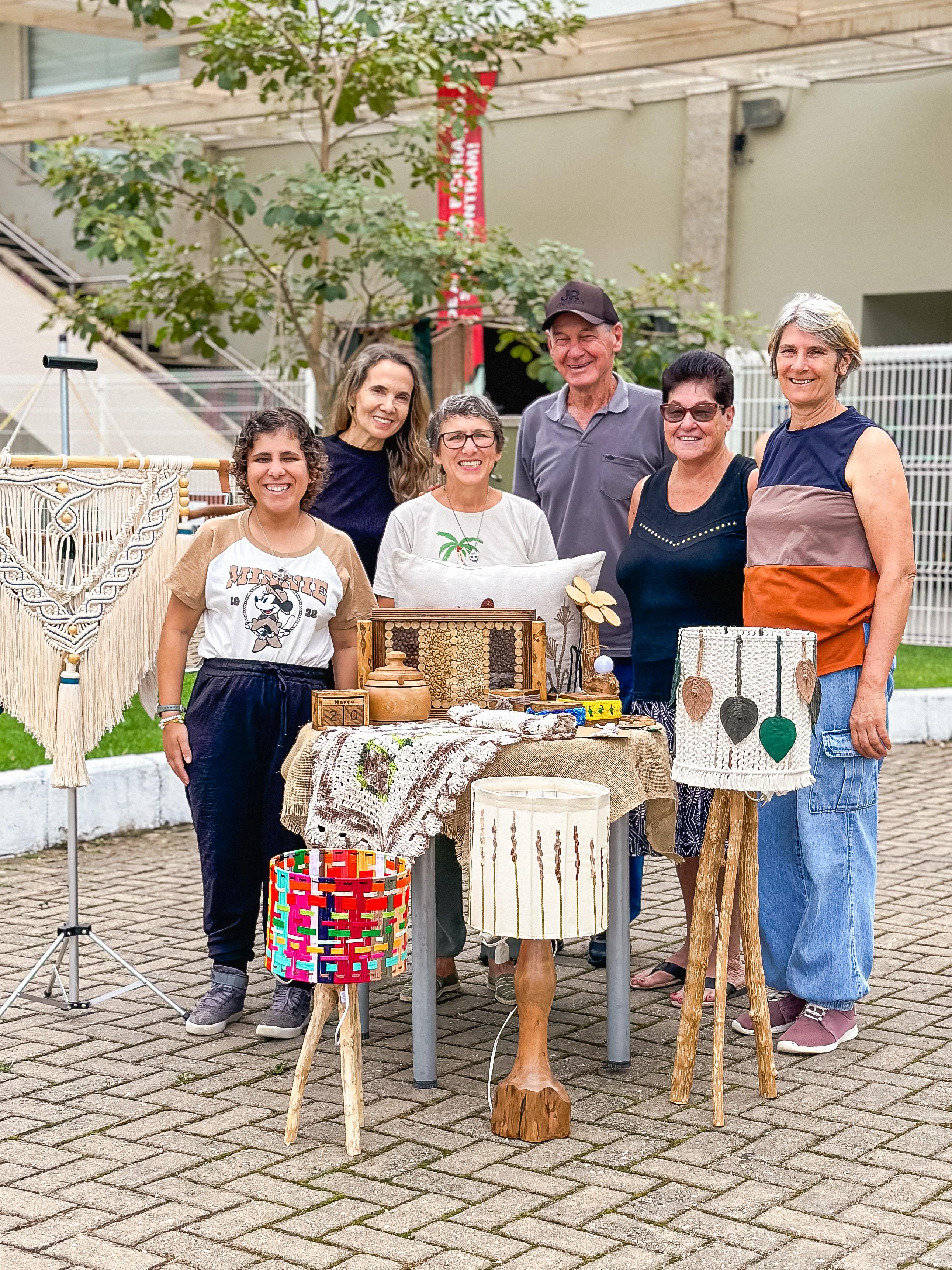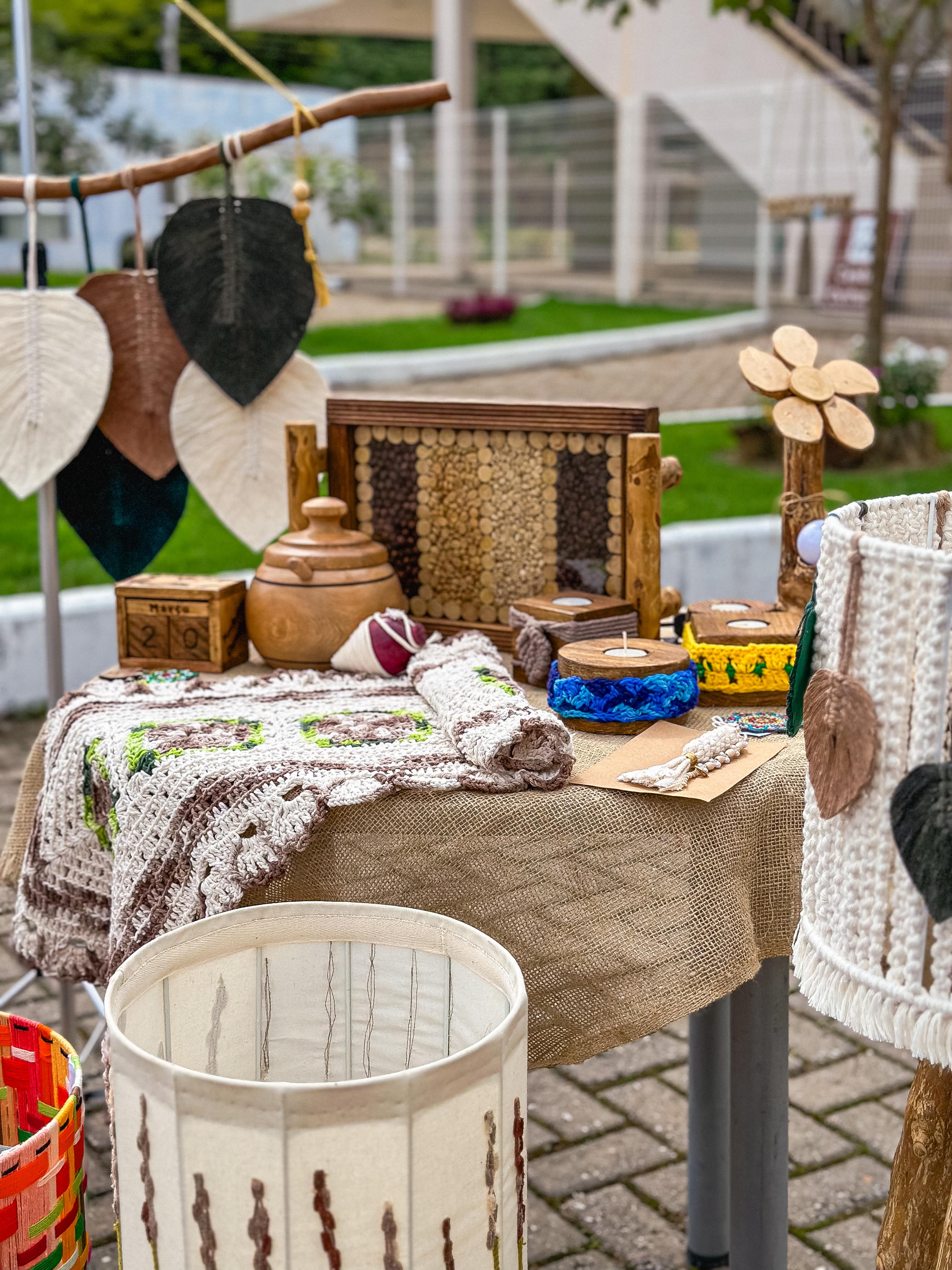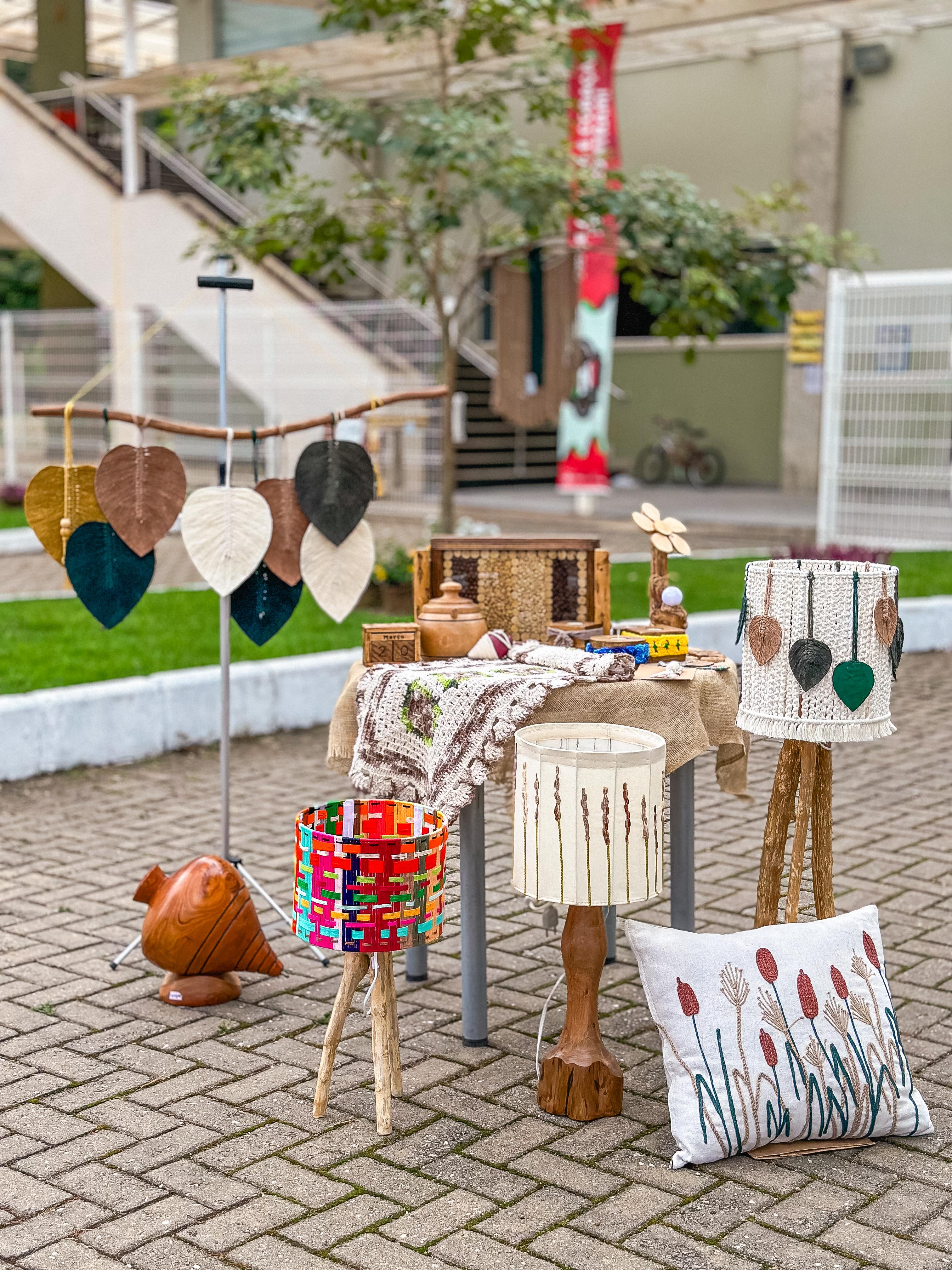 Com foco em peças feitas em madeira, fios e tecidos, a associação trabalha a partir da reutilização de materiais, promovendo o reaproveitamento de recursos e a produção artesanal consciente. São luminárias, brinquedos de madeira, bolsas, almofadas, peças em macramê, porta velas, chaveiros, itens bordados, crochê, entre outros.