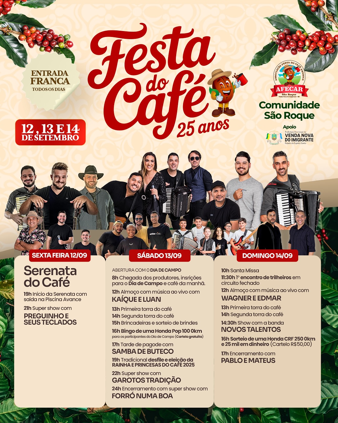 O sábado (13) será marcado pelo tradicional Dia de Campo, com chegada dos produtores às 8h, inscrições e café da manhã. A programação segue com almoço musical com Kaique e Luan, torra de café, sorteio de uma Honda Pop 100 0km (com cartela gratuita para os inscritos no Dia de Campo), pagode com Samba de Buteco e o esperado desfile e eleição da Rainha e Princesas do Café 2025. À noite, a festa continua com Garotos Tradição e show nacional de Forró Numa Boa, a partir da meia-noite.