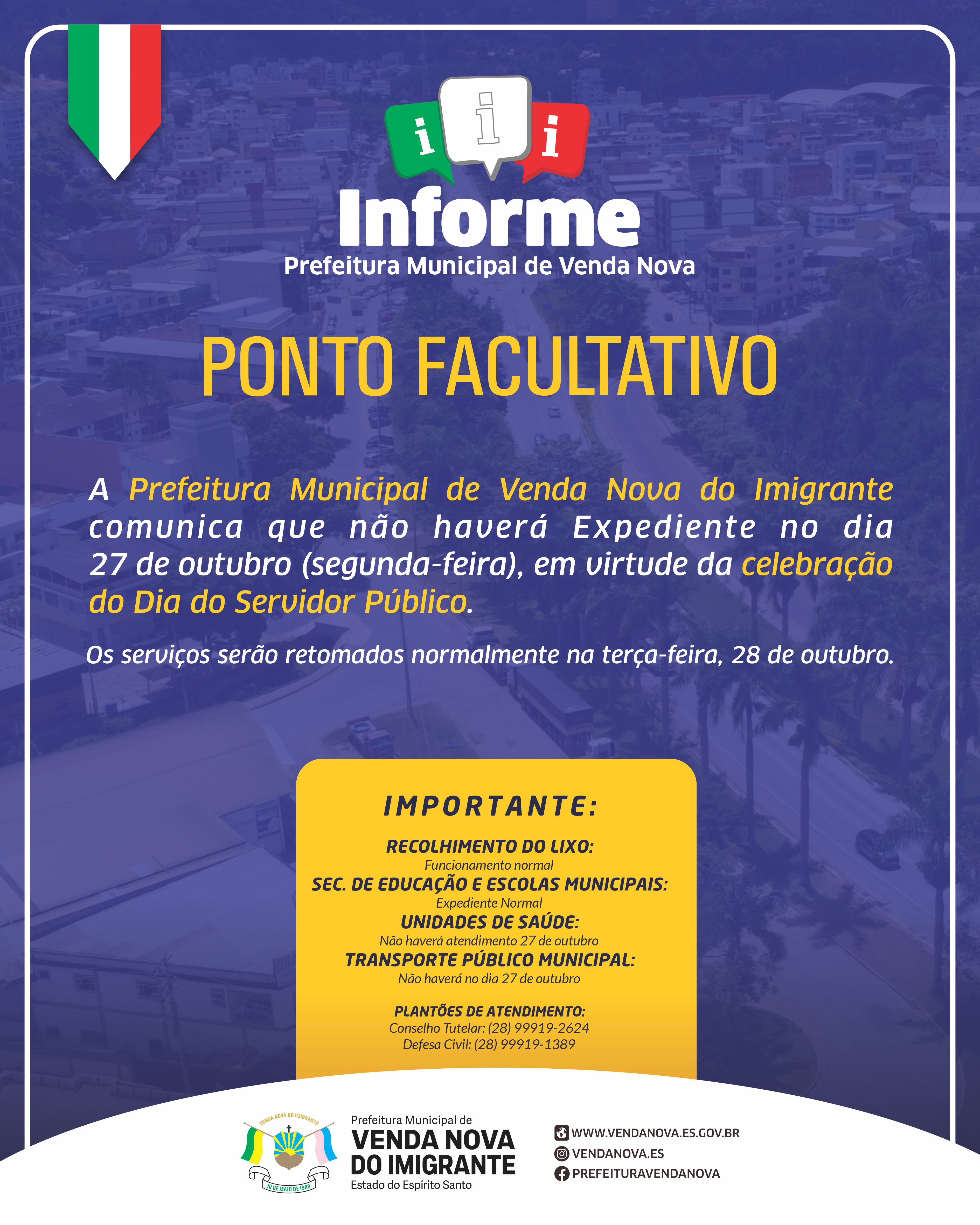 A Prefeitura de Venda Nova do Imigrante informa que não haverá expediente nas repartições públicas municipais na segunda-feira, dia 27 de outubro, em virtude da celebração do Dia do Servidor Público. A medida está regulamentada pelo Decreto Municipal Nº 5.024, publicado no início do ano com os feriados e pontos facultativos de 2025.