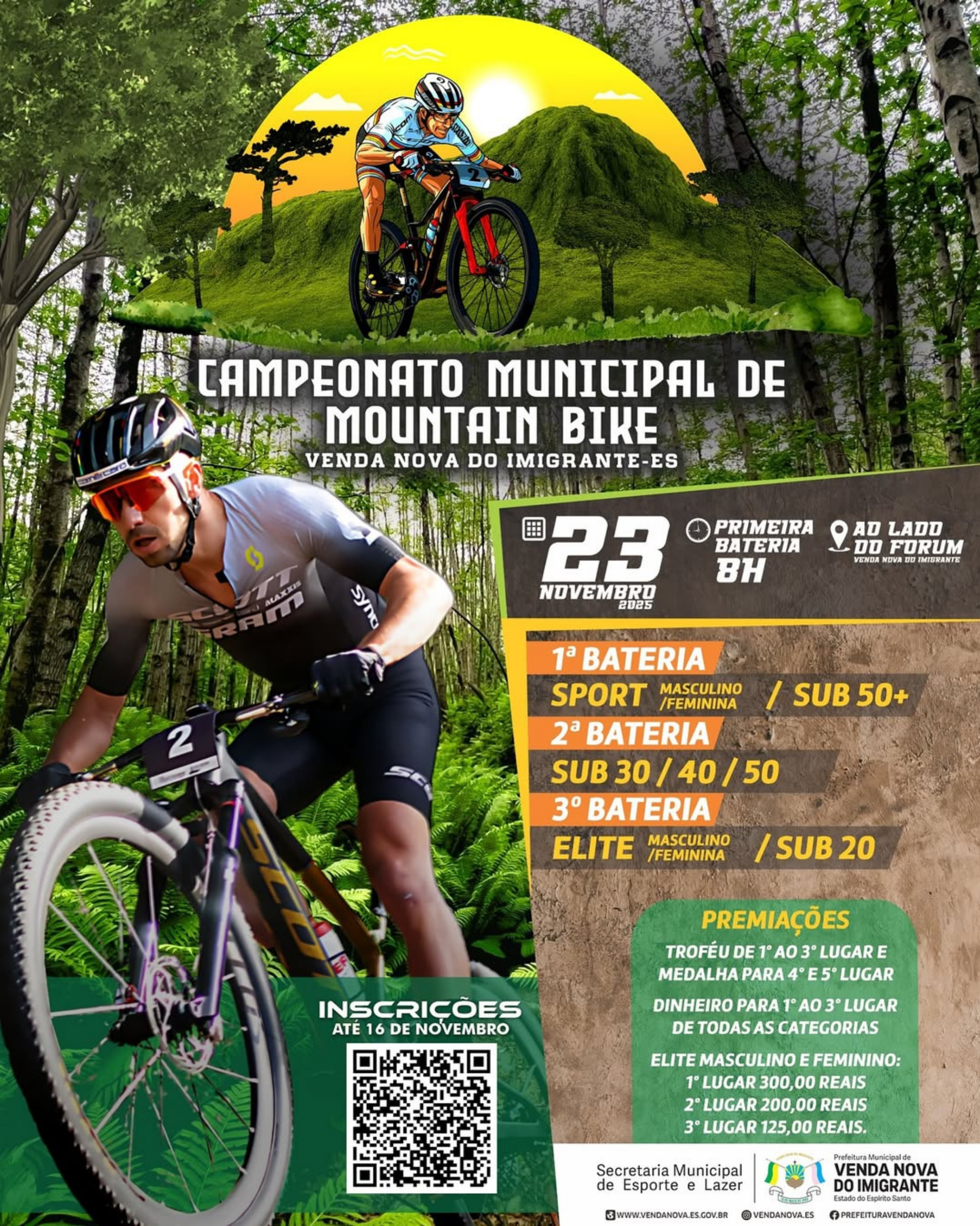 -Elite Masculino e Feminino: R$ 300 (1º), R$ 200 (2º) e R$ 125 (3º)
