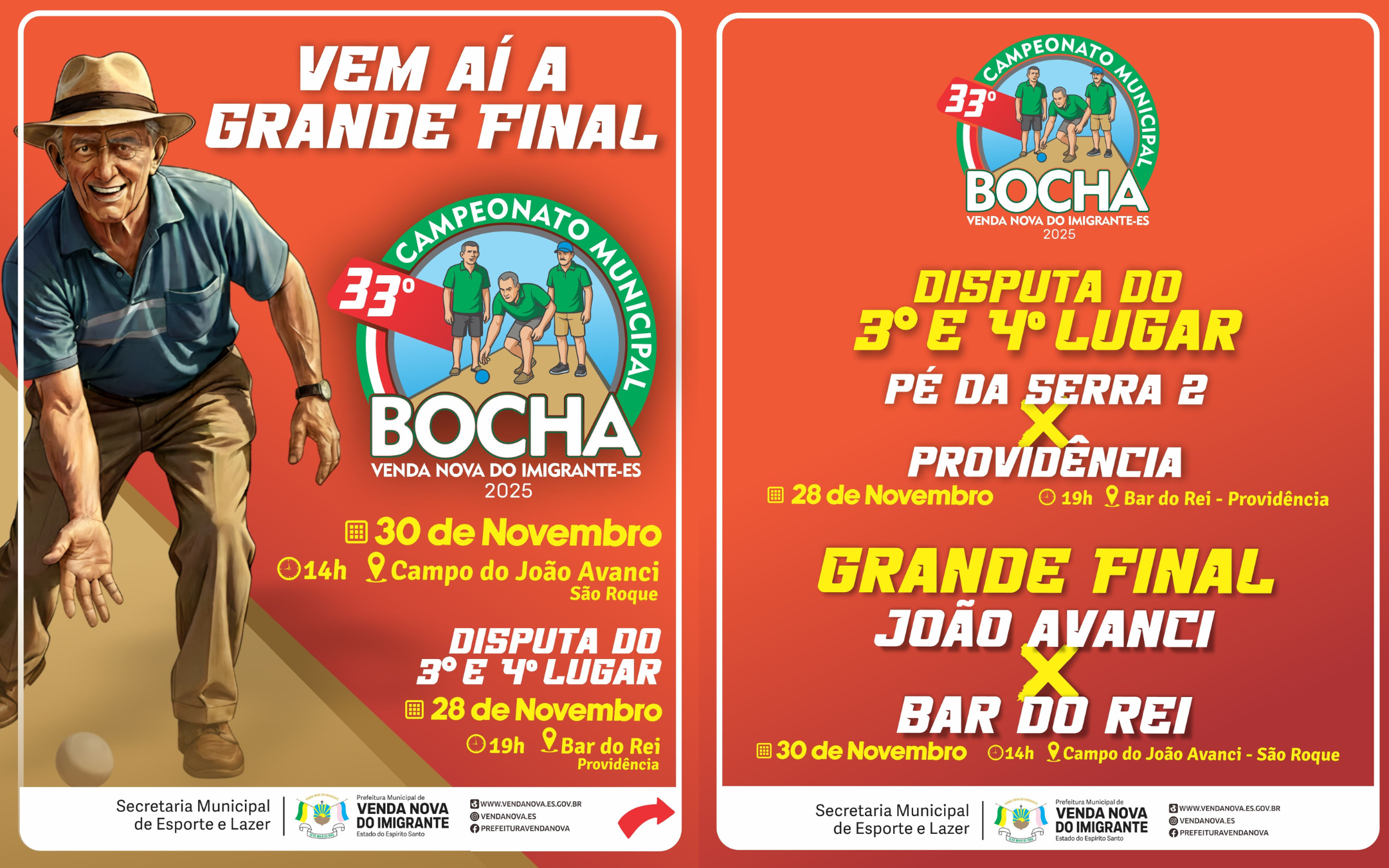 O 33º Campeonato Municipal de Bocha de Venda Nova do Imigrante entra em sua fase decisiva. Após meses de competição, iniciada em 20 de julho e envolvendo 11 equipes de diversas comunidades do município, será realizado neste fim de semana o encerramento oficial do torneio,  com as disputas pelo terceiro lugar e pela grande final.