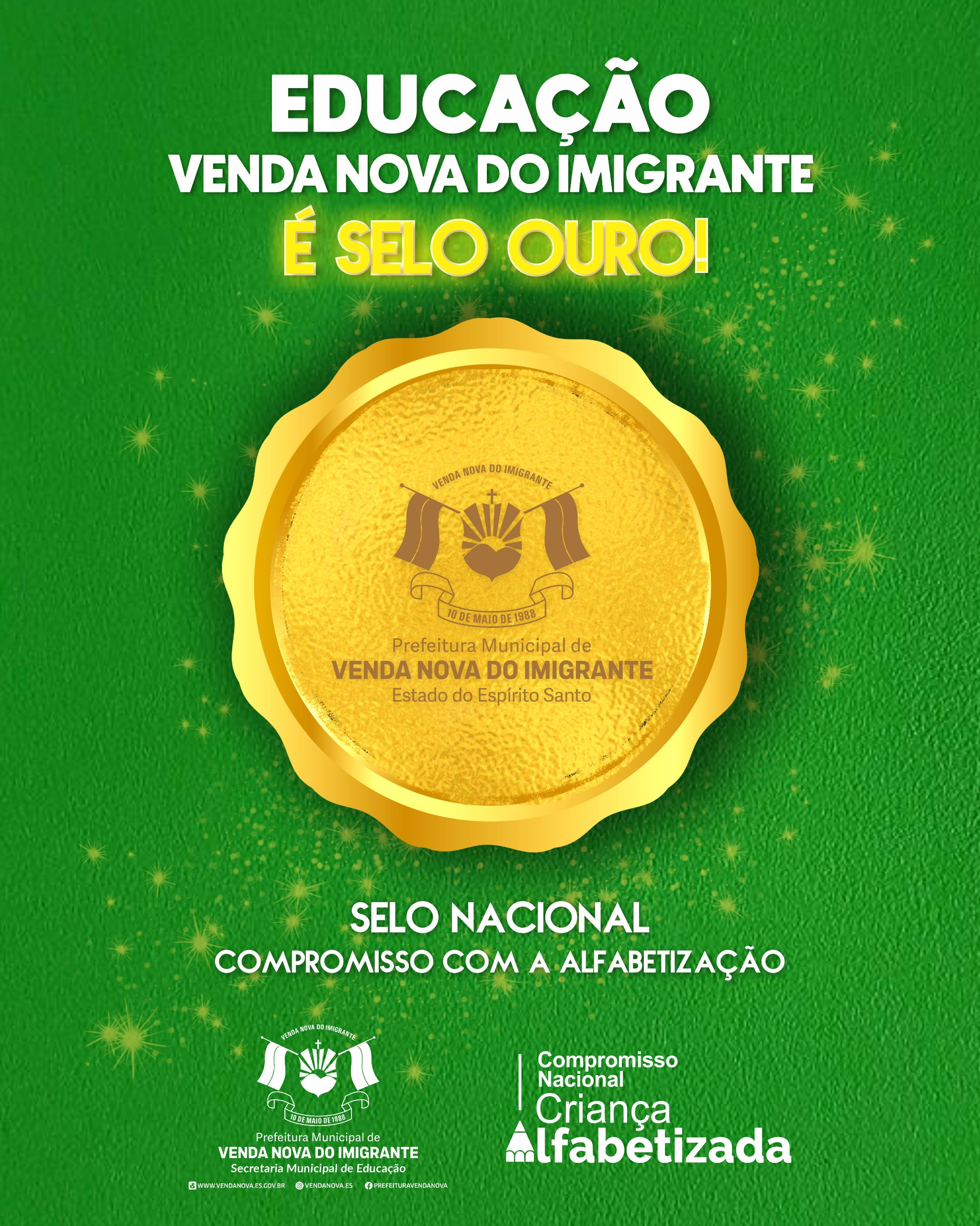 A Educação de Venda Nova do Imigrante alcançou um importante reconhecimento nacional ao conquistar o Selo Ouro do Compromisso Nacional Criança Alfabetizada, concedido pelo Governo Federal aos estados e municípios que se destacam na alfabetização de crianças na idade certa, especialmente até o 2º ano do Ensino Fundamental. A premiação reconhece os resultados e as práticas pedagógicas desenvolvidas pelo município ao longo de 2025.