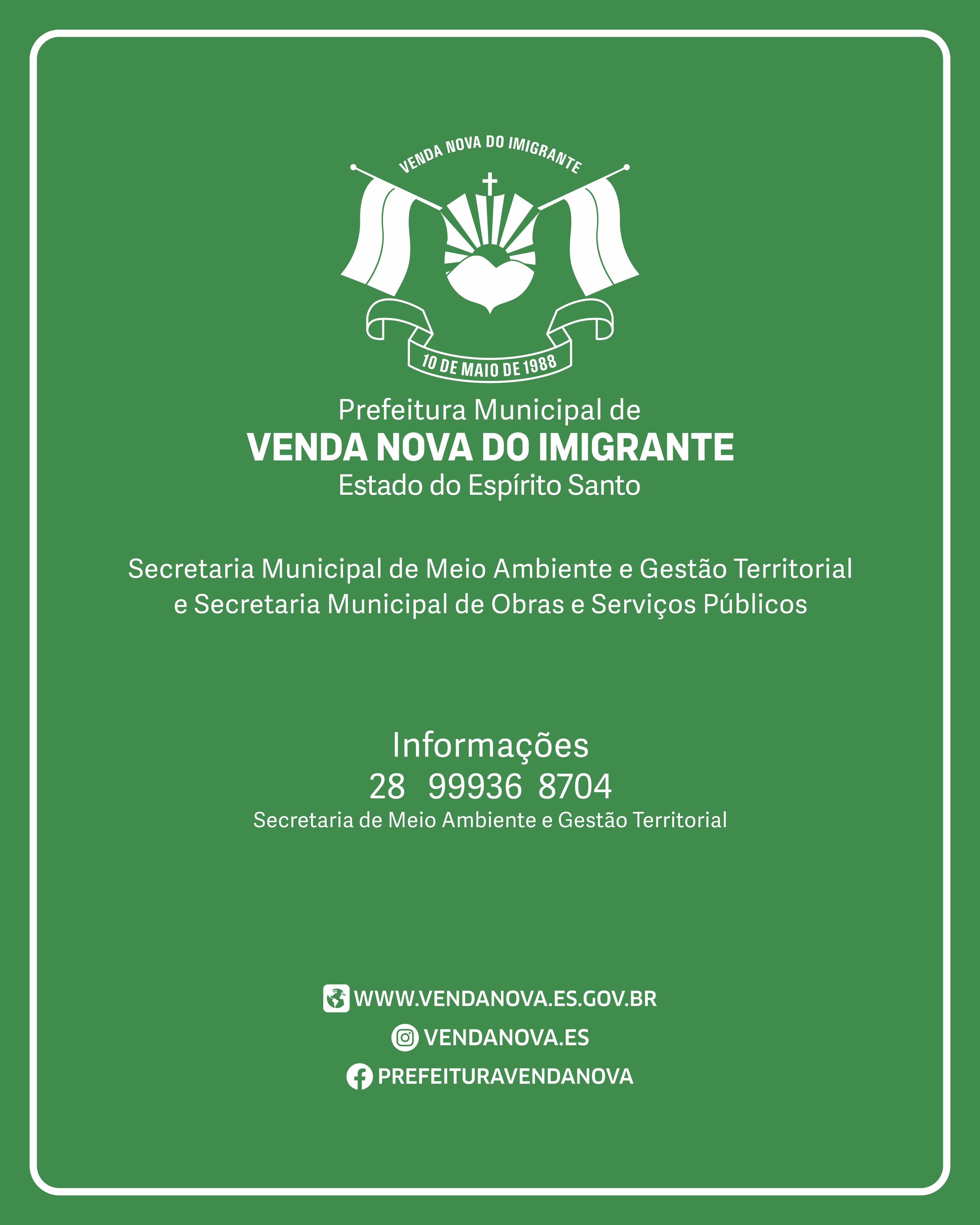 (28) 99936-8704  - Técnicos  (28) 99937-6036     meioambiente@vendanova.es.gov.br      Das 12:00h às 18:00h, de segunda à sexta.    Centro Agroambiental - Av. Domingos Perim, 1231, Providência.
